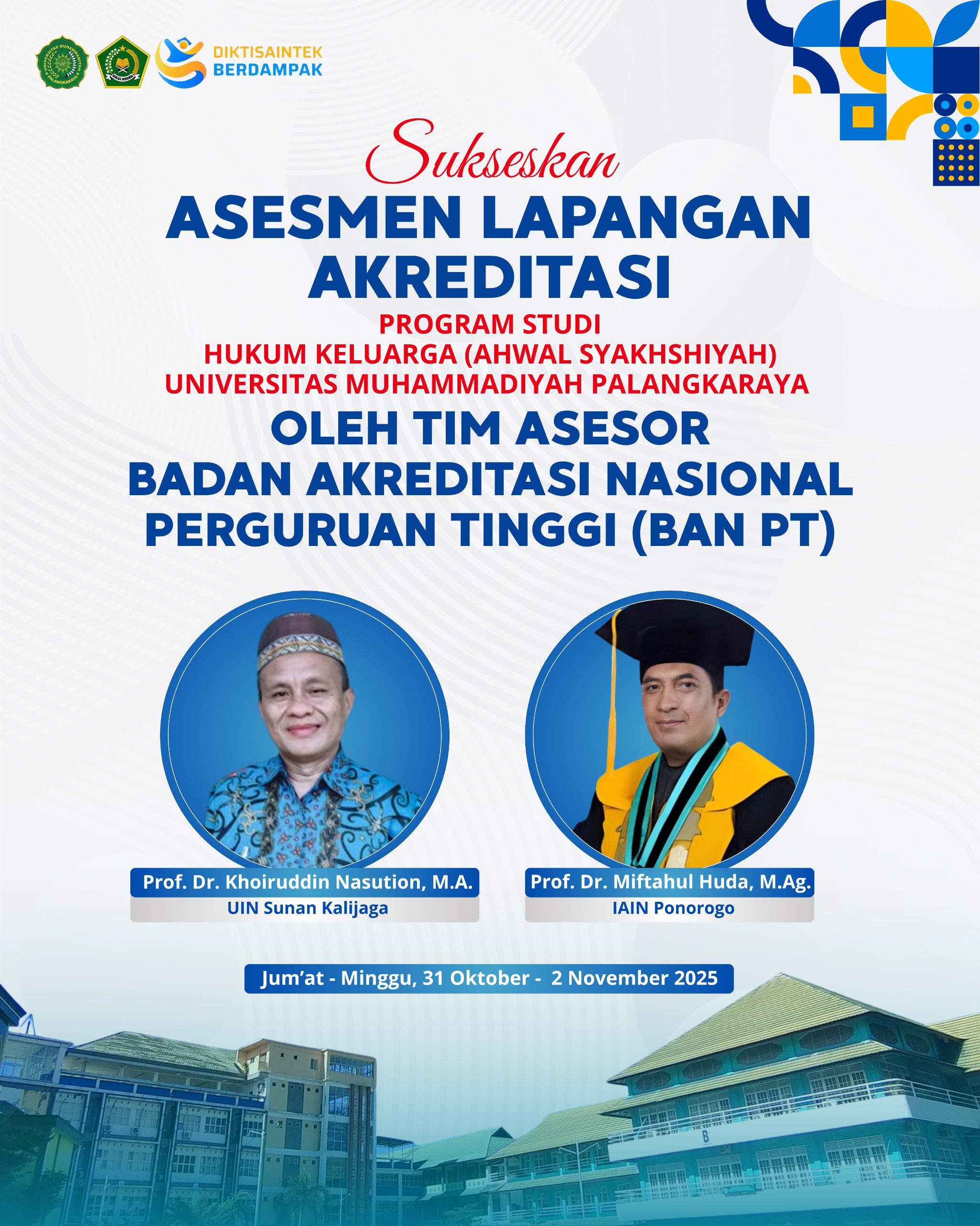 Palangka Raya – Fakultas Agama Islam (FAI) Universitas Muhammadiyah Palangkaraya (UMPR) menggelar pembukaan Asesmen Lapangan Akreditasi Program Studi Ahwal Shaksiyah (Hukum Keluarga Islam) oleh Badan Akreditasi Nasional Perguruan Tinggi (BAN-PT) pada Jum’at, 31 Oktober 2025. Asesmen ini menjadi momentum penting dalam upaya peningkatan mutu dan penjaminan kualitas program studi di lingkungan FAI UMPR. Bertindak sebagai...Read More