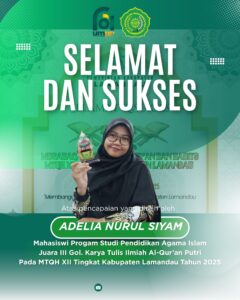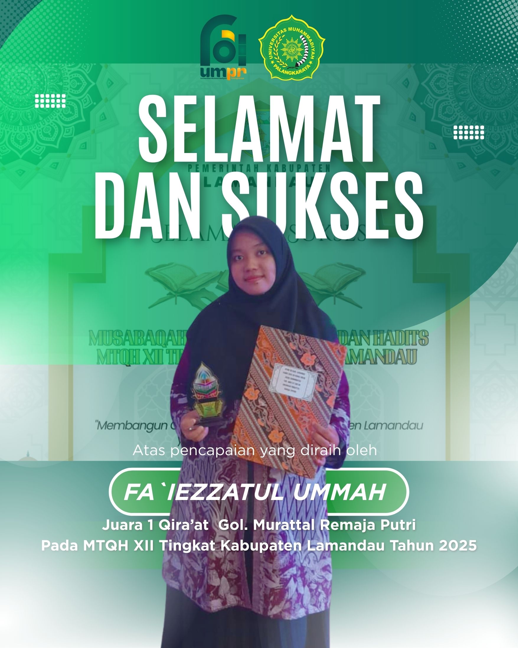 Kabar membanggakan datang dari Fakultas Agama Islam Universitas Muhammadiyah Palangkaraya. Fa’iezzatul Ummah, mahasiswi Program Studi Pendidikan Agama Islam, berhasil meraih Juara 1 Cabang Qira’at Golongan Murattal Remaja Putri, dan Adelia Nurul Isyam mahasiswa Program Studi Pendidikan Agama Islam meraih Juara 3 Cabang Karya Tulis Ilmiah Al Qur`an Putri pada ajang Musabaqah Tilawatil Qur’an dan Hadits (MTQH) XII Tingkat Kabupaten Lamandau Tahun 2025 yang berlangsung di Nanga Bulik pada tanggal 19–24 September 2025. Fa’iezzatul Ummah yang tampil sebagai kafilah dari Kecamatan Bulik, menunjukkan kualitas terbaiknya dalam melantunkan ayat-ayat suci Al-Qur’an dengan penuh penghayatan dan kaidah yang tepat, sehingga mampu mengungguli peserta lainnya. Prestasi ini tidak hanya menjadi kebanggaan pribadi bagi Fa’iezzatul Ummah, tetapi juga mengharumkan nama FAI UMPR dan membuktikan bahwa mahasiswa PAI mampu berkontribusi di kancah daerah dengan prestasi keagamaan yang gemilang. Selamat kepada Fa’iezzatul Ummah atas pencapaiannya. Semoga prestasi ini menjadi inspirasi bagi mahasiswa lainnya untuk terus berkiprah dalam syiar Al-Qur’an dan meraih keberkahan ilmu, dan selamat ber-Fsatabiqul Khairat pada Musabaqah Tilawatil Quran dan Hadits (MTQH) ke-33 Tingkat Provinsi Kalimantan Tengah Tahun 2025 di Barito Utara.